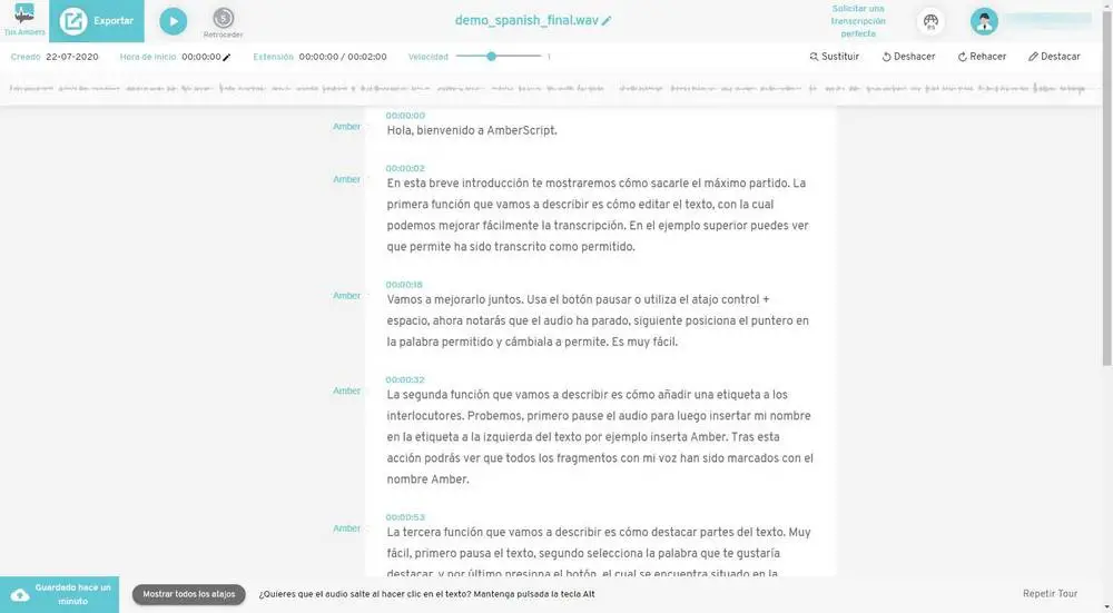 Cette plate-forme prend en charge 35 langues et possède l’une des IA de reconnaissance vocale les plus avancées , chargée d’écouter l’audio et de l’écrire avec une excellente précision . Nous pouvons tout faire à partir de son site Web, nous ne sommes donc pas liés à des systèmes d’exploitation ou à des programmes spécifiques. Tous les textes sont modifiables pour vérifier s’ils ont été bien transcrits. Et, en plus, il dispose d’un service qui nous permet d’obtenir une transcription parfaite révisée par ses propres transcripteurs professionnels.