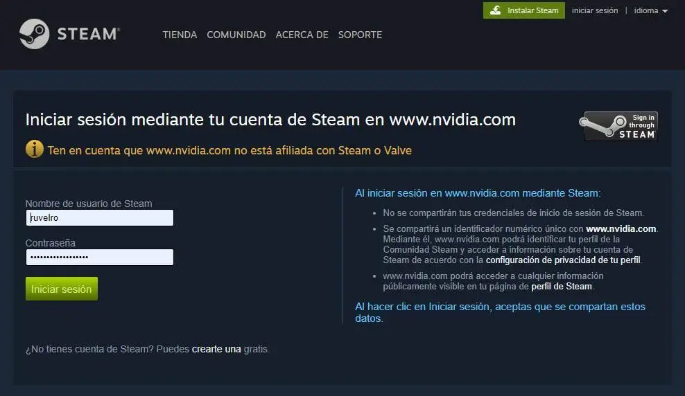 Cliquez sur ce bouton pour ouvrir une fenêtre Steam dans notre navigateur. Nous devons nous connecter au magasin à partir de cette fenêtre. Ce faisant, nous donnerons la permission, via un jeton d’accès, à GeForce NOW de voir tous les jeux que nous avons sur notre compte Steam.