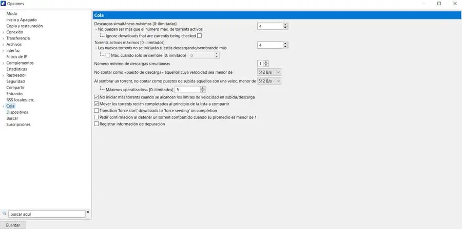 C’est une autre section à laquelle nous devrons généralement porter une attention particulière. C’est quelque chose qui est principalement dû au fait qu’à partir de là, nous aurons la possibilité d’indiquer à l’application le nombre de connexions simultanées que nous voulons utiliser. Cela affectera directement la bande passante qui sera utilisée pour chaque téléchargement, ainsi que le nombre de torrents que nous pouvons télécharger en même temps.