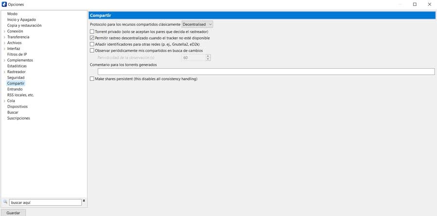 Comme pour la section susmentionnée, cette section Partager se concentre sur l’ajustement de certains paramètres lorsque nous téléchargeons notre propre contenu. Ainsi, nous pouvons les indiquer comme privés, ajouter des identifiants pour d’autres réseaux P2P , ou autoriser et refuser le suivi de notre torrent par d’autres.
