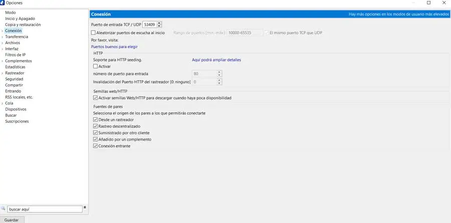Lors de la configuration et de l’optimisation du fonctionnement de ce programme spécifique dont nous parlons, l’une des sections les plus importantes est la soi-disant connexion. Et, comme vous pouvez l’imaginer, cela nous permettra de tirer le meilleur parti de nos téléchargements en fonction de la connexion que nous avons. Par conséquent, ici, nous pouvons configurer les ports que nous voulons que le programme utilise pour ces tâches que nous commentons.