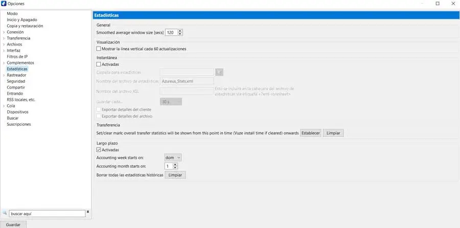 Avec tout et avec cela et si nous voulons personnaliser toutes ces données afin de les adapter à nos besoins, pour cela nous avons la section Statistiques . De là, nous pouvons configurer la mise à jour de ces informations, supprimer les passes, les enregistrer dans un fichier, ou la manière dont elles seront affichées à l’écran.