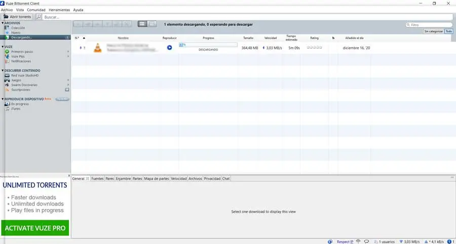 Dès que nous démarrons le programme pour la première fois, nous vous dirons que nous avons une interface utilisateur assez commune dans les clients P2P . Pour rendre tout plus simple, Vuze nous permet de faire glisser des fichiers torrent directement depuis le bureau ou depuis l’Explorateur Windows vers son interface. À ce moment-là et automatiquement, le processus de téléchargement démarre automatiquement.