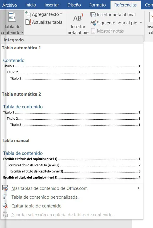 Pour ce faire, la première chose que nous faisons est d’aller à la position de Doc où nous allons ajouter cet élément. Le plus courant est peut-être de le faire au début afin de naviguer plus directement vers la section que nous souhaitons lire. Par conséquent, nous devons aller dans l’onglet «Références», où sur le côté gauche, nous voyons déjà le bouton «Table des matières». C’est à ce moment qu’une liste avec les trois types de tableaux que nous pouvons choisir dans ce cas sera affichée .