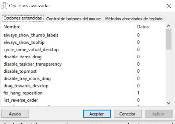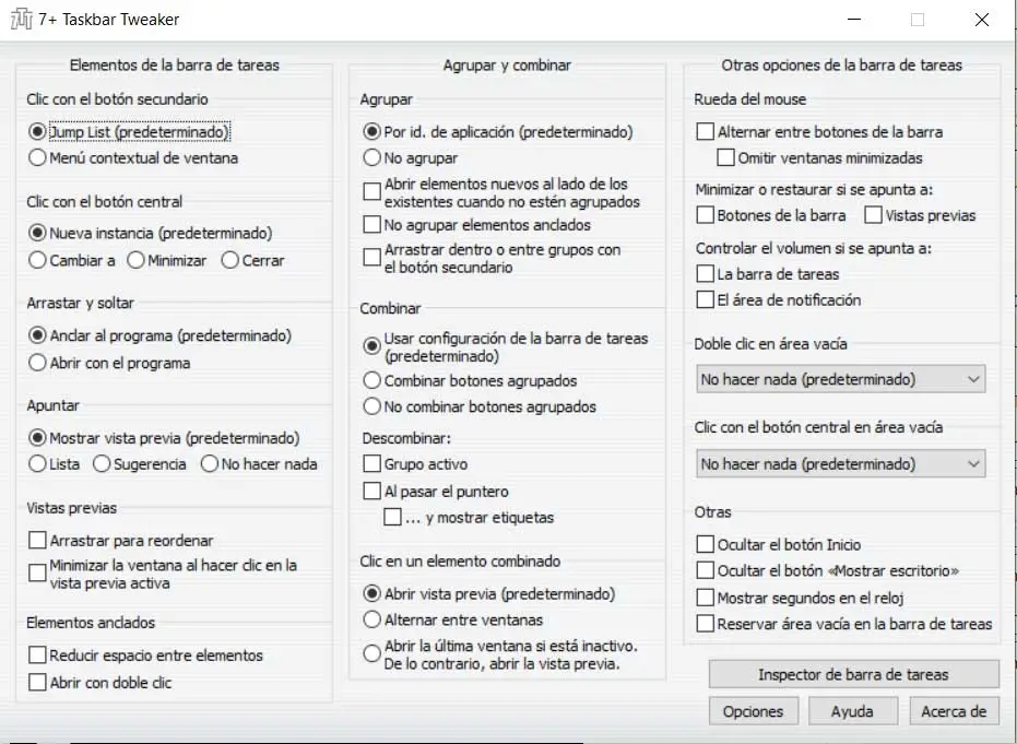 Lorsque nous double-cliquons, nous verrons que l’interface principale de configuration du programme lui-même apparaît à l’écran. Nous trouvons ici une série de paramètres qui, comme nous l’avons dit, nous permettront de personnaliser la barre des tâches de Windows 10. Ainsi, à partir de là, nous aurons la possibilité de réduire l’espace supplémentaire entre les éléments ancrés et les icônes, ou de modifier leur comportement par défaut . Autrement dit, nous pouvons spécifier ce qu’il faut faire en double-cliquant sur certains de ces accès à la barre.