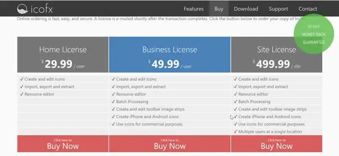IcoFX est un programme professionnel pour créer des icônes et des curseurs de paiement. Il propose trois types de licence et une version d’essai gratuite de 14 jours que vous pouvez télécharger sur son site Web. Les plans tarifaires si nous voulons acheter IcoFX sont les suivants: