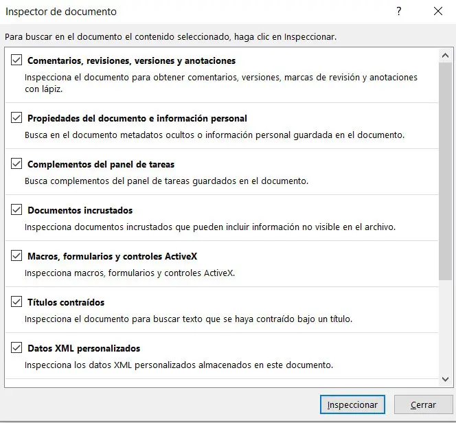 Ainsi, dans cette section, nous pouvons marquer, ou non, les éléments à analyser tels que les contrôles ActiveX inclus, les macros, les titres ajoutés, les propriétés de document, les commentaires et critiques, ou les documents incorporés , entre autres. Une fois que nous avons marqué les objets avec lesquels nous voulons travailler, il suffit de cliquer sur le bouton «Inspecter» situé en bas.