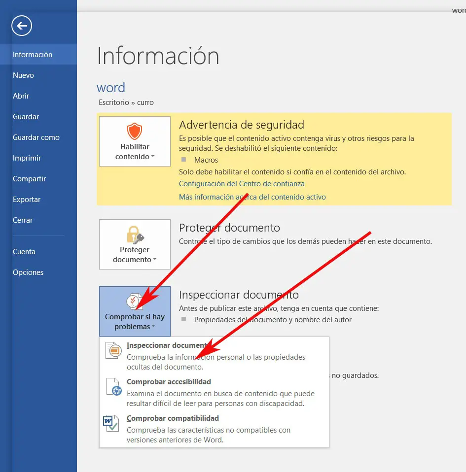 Par conséquent, pour accéder à la fonctionnalité à laquelle nous nous référons, une fois que nous aurons fini avec le document en tant que tel, nous devrons aller dans le menu «Fichier» du programme. Ici, plus précisément en bas, nous trouvons une section intitulée «Inspecter le document», où nous cliquons pour accéder aux options disponibles.