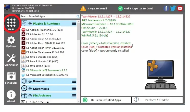Comme vous pouvez le voir sur l’image, les applications qui apparaissent en vert seront celles qui sont mises à jour, celles qui apparaissent en rouge sont celles qui nécessitent une mise à jour et en noir celles que vous devez installer sur votre ordinateur pour optimiser leurs performances.