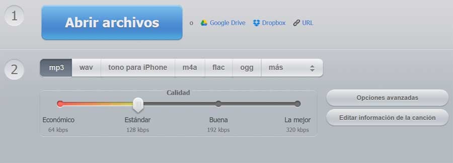 Mais ce n’est pas tout, mais nous présentons ici une autre alternative similaire à utiliser en ligne à partir de cette URL qui permet des conversions entre une multitude de fichiers audio. Et ce n’est pas tout, car il dispose également d’une fonction pour extraire le son des fichiers vidéo que nous mettons en ligne. Disons qu’il prend en charge les formats les plus populaires tels que WMA, MP3, WMA ou OGG et ne présente aucune complication dans son utilisation.