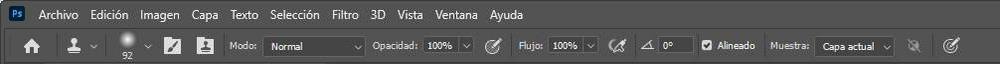 En haut, nous pouvons trouver une barre d’ outils à partir de laquelle nous pouvons configurer davantage le fonctionnement de ce tampon et l’adapter à nos besoins. Les options que nous trouverons ici sont, fondamentalement, les mêmes que celles que nous trouverons dans n’importe quel autre pinceau. Par exemple, nous pouvons ajuster la taille, l’opacité, le débit, l’angle, etc. La section qui apparaît à droite, «échantillon», nous permet de choisir le calque source à partir duquel nous voulons cloner l’image. Très utile lorsque vous souhaitez sélectionner un objet sur un calque et le cloner sur un autre calque.