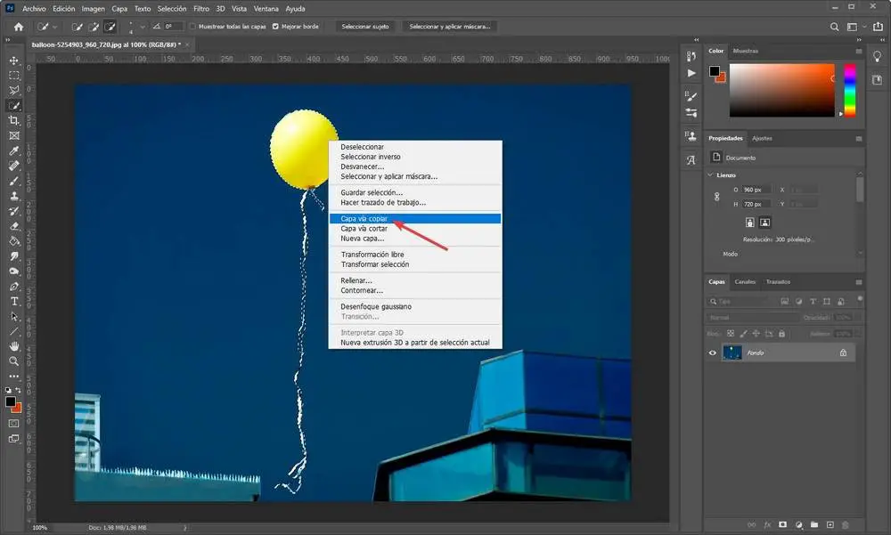 Maintenant que nous avons sélectionné l’objet, la prochaine chose sera de le copier dans un nouveau calque. Pour ce faire, nous cliquons avec le bouton droit de la souris sur la sélection, et choisissons l’option « Calque via copie ». Cela créera un calque transparent au-dessus de l’image d’origine, en plaçant l’objet dessus.