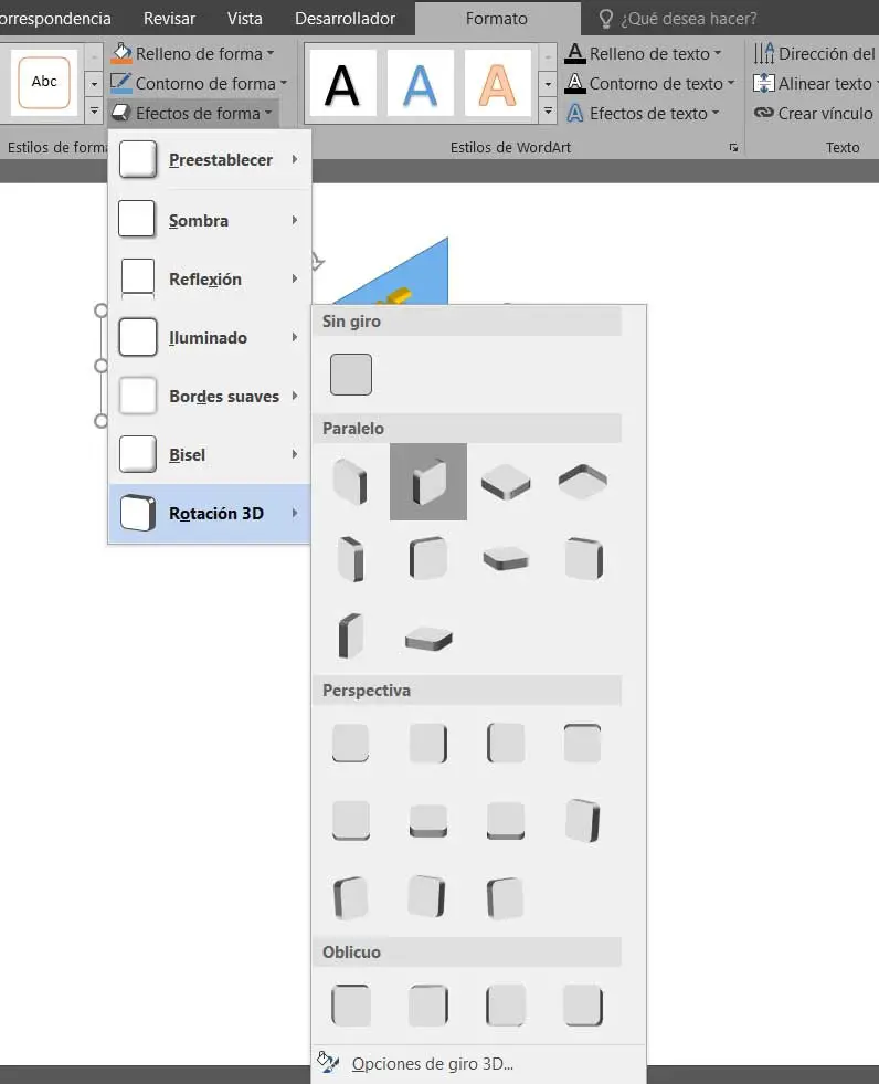 D’autre part, nous trouvons la section intitulée Effets de forme, qui peut être l’une des plus frappantes pour cette conception. Nous vous disons cela car à partir de cette section, nous aurons la possibilité d’intégrer une série d’effets attrayants au design WordArt que nous créons en ce moment. Pour tout cela nous avons une multitude d’effets liés à l’ombrage, l’éclairage, le lissage des bords, l’ajout d’un biseau , voire un aspect 3D .