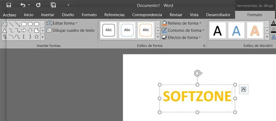 Il convient de mentionner, ce que nous allons vérifier de première main, que les textes que nous créons avec cette fonction ne sont pas traités comme des textes Word conventionnels. Plus précisément, nous allons devoir travailler avec eux plus comme une image que comme un texte, du moins dans la vue de Word et la façon de le configurer. Ainsi, une fois que nous avons sélectionné l’exemple que nous voulons utiliser, une série de nouvelles options apparaîtra dans le menu principal de Word. Plus précisément, nous trouvons un onglet qui apparaît et à partir duquel nous aurons la possibilité de personnaliser cet élément que nous allons créer.