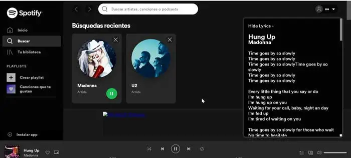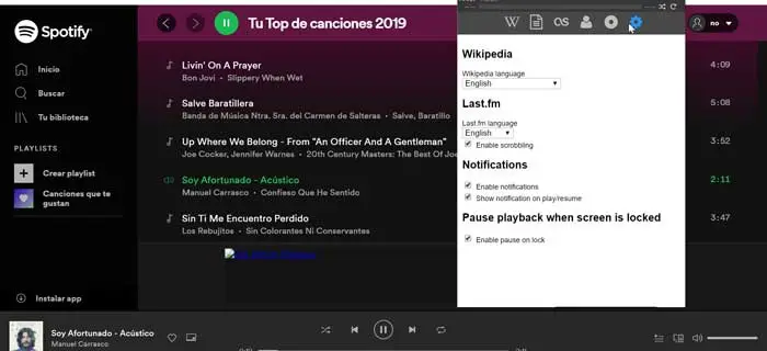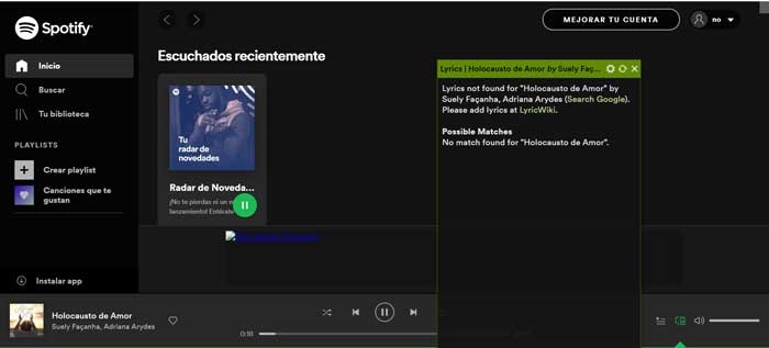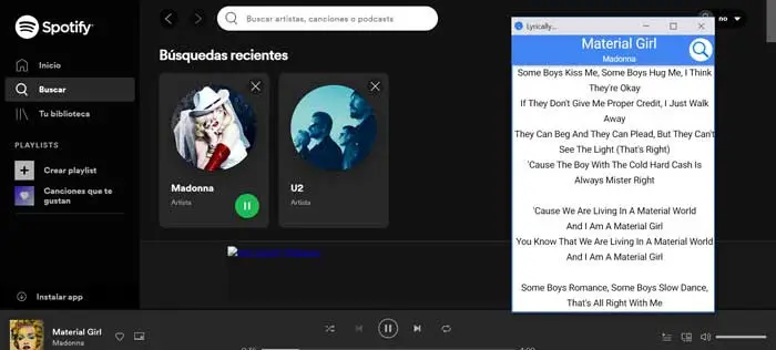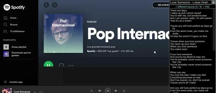 Con este plugins para Spotify podremos ver las letras de las canciones que estamos escuchando a través de la versión web. Esta aplicación nos permitirá visualizar las letras en una ventana emergente junto con la imagen incrustada de la portada del álbum. Una vez se abre la ventana y arrancamos la canción las letras aparecerán de manera automática en ella.