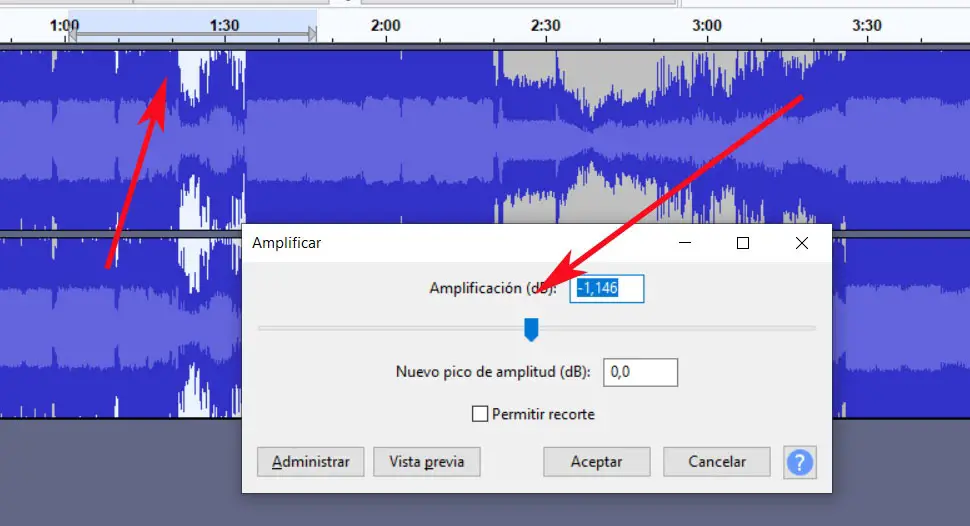 Une fois cette partie marquée, il ne reste plus qu’à aller dans le menu «Effet» et sélectionner l’option «Amplifier». Ici, nous pouvons spécifier le niveau d’augmentation des décibels pour cette partie de l’audio en particulier.