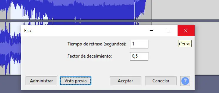 Pour ce faire, nous retournons dans le menu «Effet», bien que dans ce cas, après avoir sélectionné la partie de la piste, nous cliquons sur l’option «Eco». Cela conduit à une nouvelle fenêtre dans laquelle nous spécifions le temps de retard de l’effet lui-même à ajouter, comme sa profondeur . Disons que nous avons un bouton de prévisualisation pour vérifier les changements en temps réel.