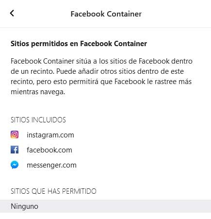 De plus, en cliquant sur l’icône qui sera créée à côté de la barre de navigation, nous pouvons indiquer les plateformes pour lesquelles le conteneur sera actif. Ceci est important car c’est quelque chose qui, en plus de celui mentionné, bloque également le suivi d’ Instagram et de Messenger . Au contraire, la même extension nous permet également d’exclure les URL de ces restrictions afin que nous puissions interagir avec la plate-forme.