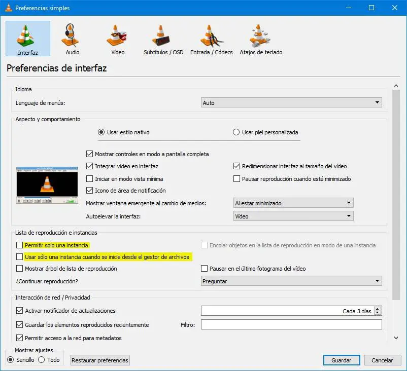 Dans la section «Interface», nous trouverons les options pour la playlist et les instances. Voici deux options qui nous intéressent: