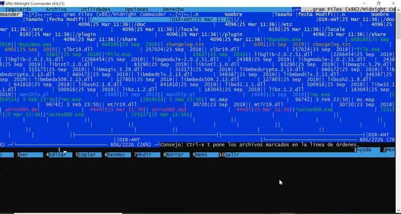 Midnight Commander est un programme de gestion de fichiers populaire pour Linux et Windows qui fonctionne en mode texte. Il comporte deux panneaux sur l’écran principal à partir desquels le système de fichiers est affiché. Il est basé sur des interfaces texte polyvalentes telles que Ncurses ou S-Lang qui nous permettent de travailler comme une console normale via des connexions SSHH et toutes sortes de cas distants. Il a de nombreuses fonctions qui nous permettront de copier, déplacer et supprimer des fichiers complets, ainsi que d’exécuter des commandes de sous-shell. Il comprend également un gestionnaire de transfert FTP, un client de protocole FISH et un éditeur appelé mcedit. Avec cet outil, il est possible d’explorer le contenu RPM et de travailler avec des fichiers communs.