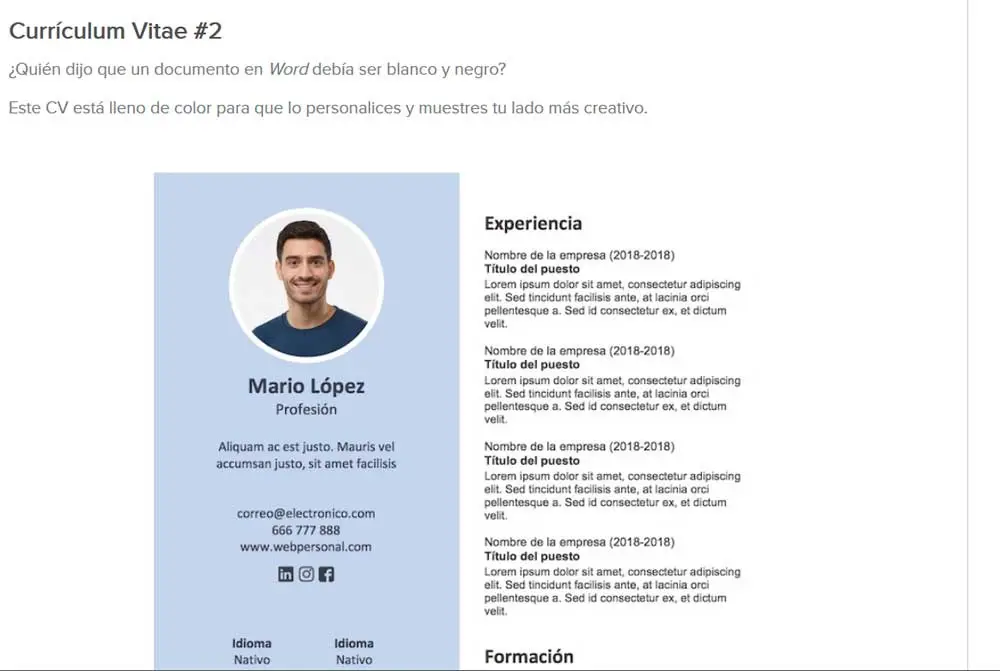 De cette manière, par exemple, dans ce cas, nous allons nous concentrer sur le curriculum vitae qui nous accompagne depuis si longtemps. Ainsi, nous pouvons instantanément avoir ces CV déjà prédéfinis, en plus d’une manière attrayante, pour saisir nos données. Il est clair que les modèles servent de base, mais bien que nous ayons économisé beaucoup de travail, nous devons également les personnaliser.