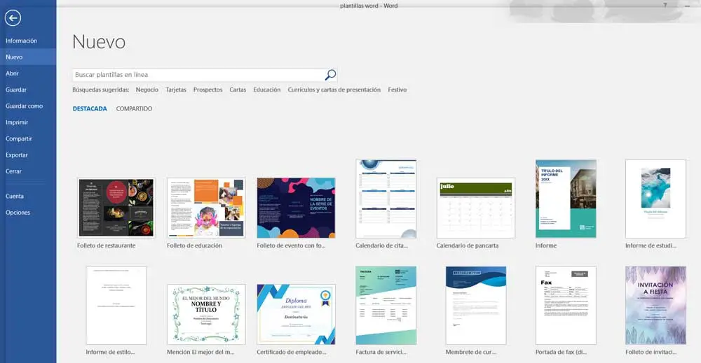 La première chose à savoir est que le programme lui-même nous présente ses propres modèles de ce type, ce qui nous fera gagner du temps dans la recherche de ces éléments. Pour ce faire, ouvrez simplement l’application et effectuez la recherche correspondante dans la boîte de dialogue qui apparaît avant d’ouvrir un nouveau document .