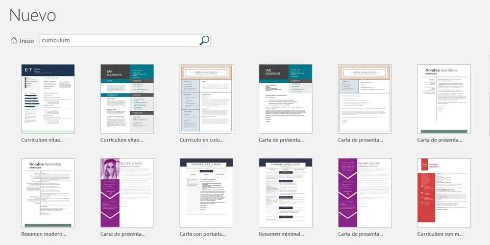 Comme à nouveau son propre nom nous permet de l’apercevoir, nous allons également trouver ici un bon nombre d’éléments de ce type à utiliser dans Word . Ainsi, après avoir accédé à partir d’ ici , nous trouvons directement avec plusieurs exemples sous forme de modèles qui nous aident à créer notre curriculum personnel. Par conséquent, il suffit de cliquer sur celui que nous aimons ou adaptons le plus, pour le télécharger sur le PC et l’utiliser depuis le programme Redmond.