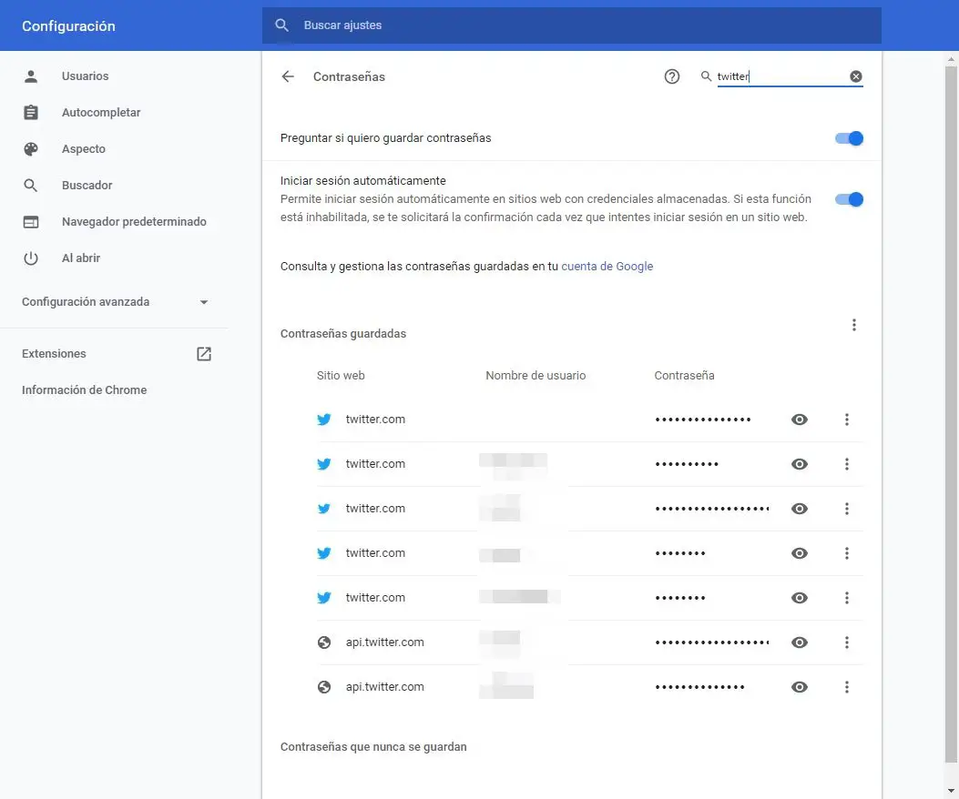 Une fois supprimé, nous retournons sur le site Web en question (dans notre cas, Twitter) et nous nous connecterons avec notre nom d’utilisateur et notre nouveau mot de passe . Google Chrome nous montrera un nouveau message dans lequel il nous demandera si nous voulons enregistrer le nouvel utilisateur et le nouveau mot de passe. Nous disons oui et c’est tout. Nous aurons déjà le nouveau mot de passe mis à jour dans Google.
