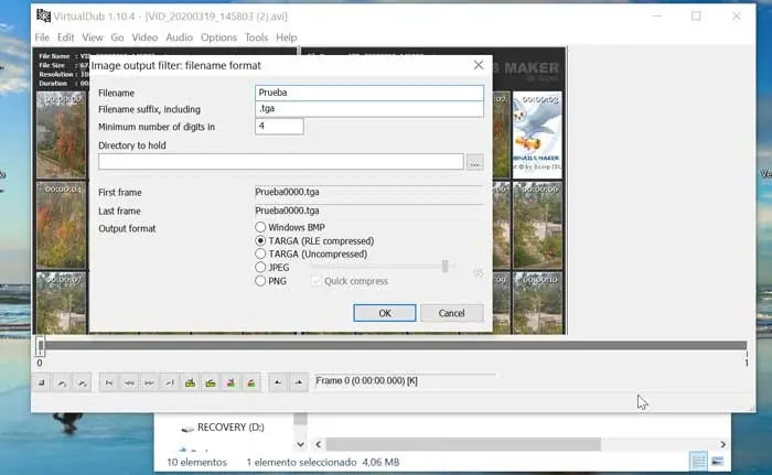 Il est également possible, grâce à l’utilisation de ce logiciel, la possibilité d’ extraire des images d’une vidéo ou d’enregistrer des captures , ce qui peut être très utile. Le processus pour le faire est similaire au précédent, en allant d’abord dans l’onglet «Fichier». Cliquez à nouveau sur «Exporter» et enfin sur «Séquence d’images». Le programme nous permettra de sélectionner le format de sortie de l’image en trouvant les options JPEG, PNG et TARGA.