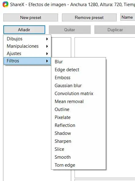 De cette façon, au cas où nous voudrions appliquer l’un des filtres que ShareX nous met entre les mains, nous avons dit Ajouter / Filtres, où nous en trouvons plusieurs. Dans le même temps et dans l’option Paramètres, nous voyons également un bon nombre de paramètres avec lesquels nous pouvons améliorer l’apparence de la capture chargée.