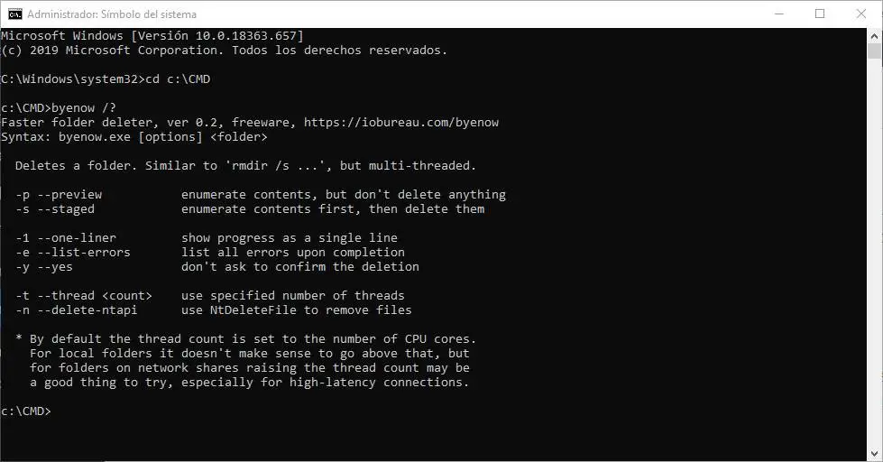 Avec ce programme, et les paramètres appropriés, nous pourrons créer nos propres scripts .bat afin que, si nous supprimons souvent des dossiers très volumineux avec de nombreux fichiers (par exemple, des répertoires temporaires comme ceux du navigateur ou ceux de Spotify) , nous pouvons automatiser et accélérer le processus.