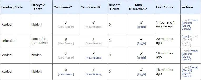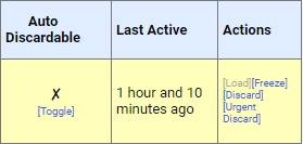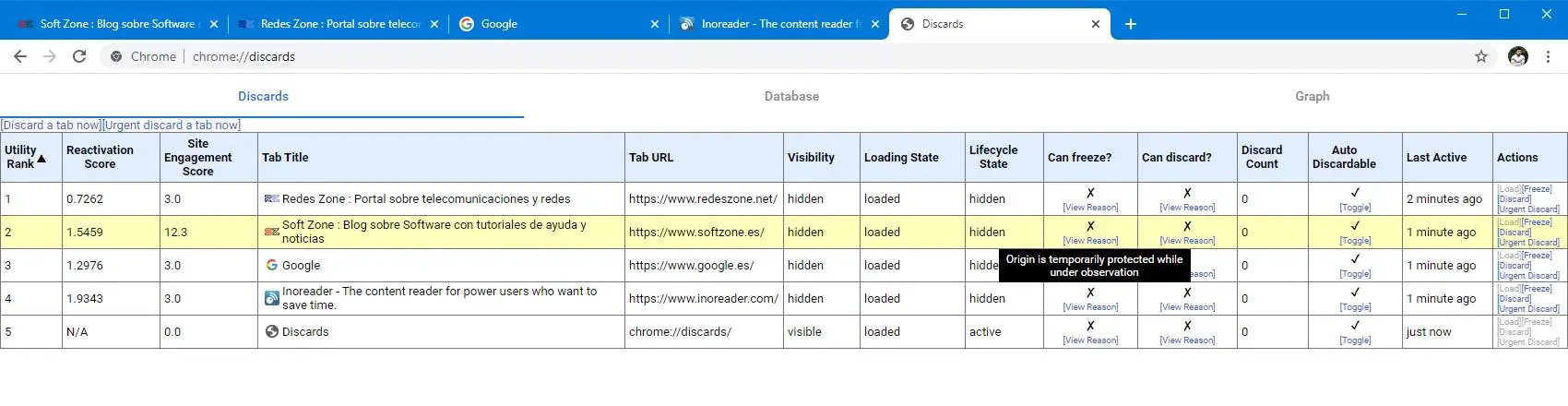 Dans cette nouvelle page, nous pourrons voir tous les onglets que nous avons ouverts dans le navigateur. En plus de son titre, nous pourrons également voir des informations connexes sur la question de savoir s’il peut être jeté, s’il peut être gelé et même le temps qui s’est écoulé depuis la dernière fois que nous l’avons utilisé.