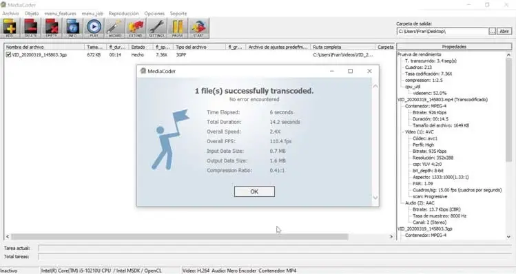 Une fois la vidéo, le format de conversion et le dossier de sortie sélectionnés, il ne vous reste plus qu’à cliquer sur le bouton supérieur «Démarrer» pour que le programme lance la conversion du fichier . La durée dépendra de plusieurs facteurs tels que la taille du fichier, le format choisi et la capacité de traitement de notre ordinateur. Une fois terminé, une affiche apparaîtra pour nous informer du déroulement du processus et du temps qu’il a fallu.
