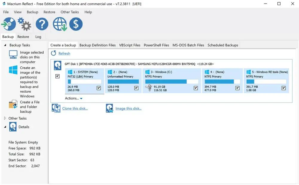 Macrium Reflect est un autre des programmes les plus populaires pour sauvegarder des fichiers, travailler avec des images de disque et de partition et cloner des disques entiers. Ce programme a tout ce dont vous avez besoin pour travailler avec les données sur n’importe quel disque dur, étant capable de créer des sauvegardes simples ou de cloner des disques durs.