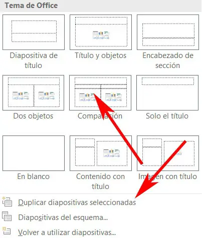 Eh bien, c’est quelque chose que nous vous recommandons de revoir chaque fois que vous commencez à travailler sur l’un de ces éléments et que nous allons ajouter à la présentation. Par conséquent, pour sélectionner le design d’une nouvelle diapositive , nous allons d’abord dans «Démarrer» et cliquez sur «Nouvelle diapositive» depuis l’interface principale du programme. Ici, une liste déroulante s’ouvrira avec les exemples que nous avons disponibles dans cette section. Comme on dit, en fonction du contenu que l’on va mettre en œuvre ou du type d’élément que l’on conçoit, on optera pour un format ou un autre.