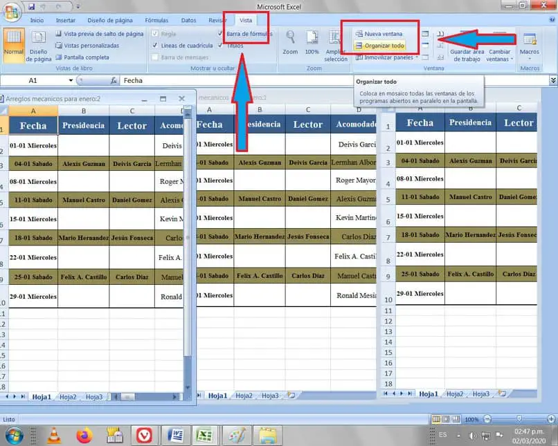 - Ensuite, nous retournons à l’onglet Affichage et sélectionnons l’option pour tout organiser . Il faut préciser dans la fenêtre d’options qui s’ouvre, quelle sera la manière dont on souhaite que les informations soient affichées, qu’elles soient parallèles, verticales ou en cascade.