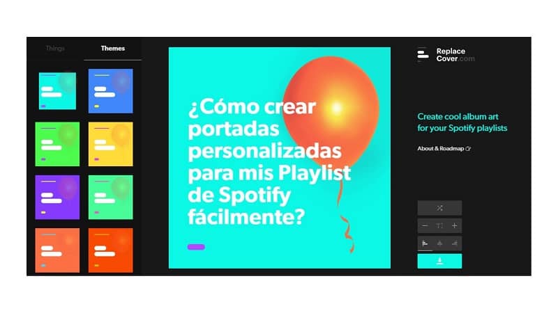 Pour créer une couverture pour vos listes de lecture avec Re place Cove r, il vous suffira d’entrer sur leur site Web . Lorsque vous êtes à l’intérieur de la page, vous verrez un exemple de couverture, vous pouvez le modifier à votre guise, changer l’image de fond, le contenu et la position du texte à l’aide des boutons situés dans le coin inférieur droit de l’écran.