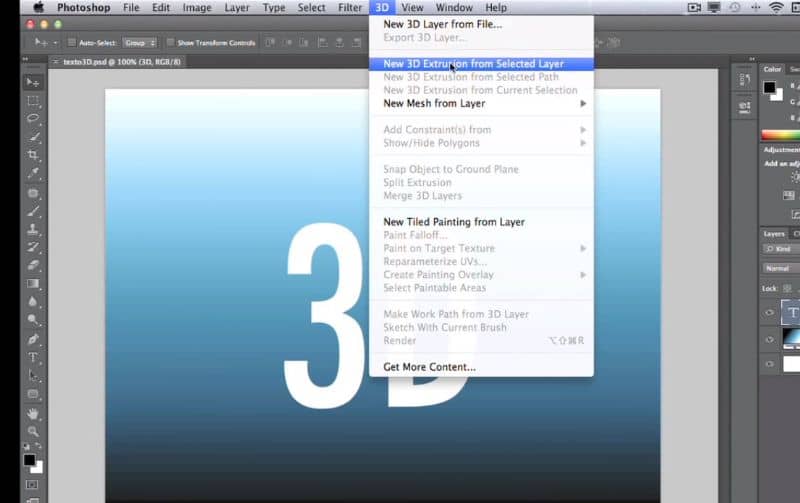 Ensuite, vous devez sélectionner l’option «3D» dans le menu supérieur, qui affiche plusieurs options où vous pouvez trouver «nouvelle extrusion 3D» à partir du calque sélectionné.