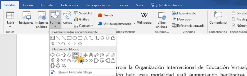 - Après avoir créé la première figure, vous revenez dans la barre «Insertion» et cliquez sur l’option «Formes» Il vous faut maintenant choisir la flèche ou la ligne qui servira de connexion entre un cadre et un autre.