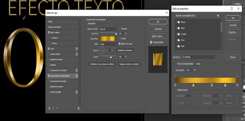 Ainsi, en suivant ces étapes et méthodes simples, vous pouvez obtenir la texture dorée que vous voulez tant pour vos créations avec Adobe Photoshop . De plus, des valeurs ont été ajoutées pour obtenir une touche tridimensionnelle au texte afin qu’il soit plus réel et que vous obteniez cet impact avec l’effet or.