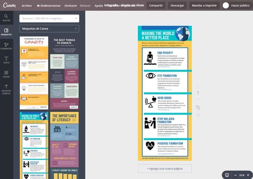 Lorsque vous avez un modèle que vous aimez pour votre infographie, ouvrez-le et commencez à utiliser tous les petits détails que vous pouvez ajouter via Canva. Tout ce que vous avez à faire est d’utiliser les options que vous avez sur le côté gauche de l’ écran .