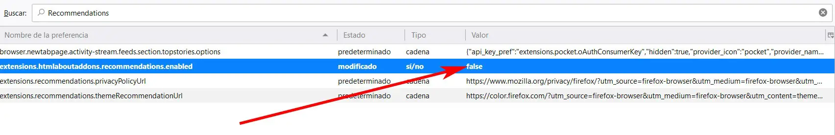 Par conséquent, tout d’abord, ce que nous allons faire est de taper «about: config» dans la barre d’adresse du programme, puis de faire une recherche dans la case correspondante pour le terme «Recommandations», par exemple. Ensuite, plusieurs entrées apparaîtront à l’ écran, parmi lesquelles nous regardons «extensions.htmlsobreaddons.recommendations.enabled», dont nous devons changer le statut pour désactiver ce que nous commentons en double-cliquant dessus et en définissant sa valeur comme «False «.
