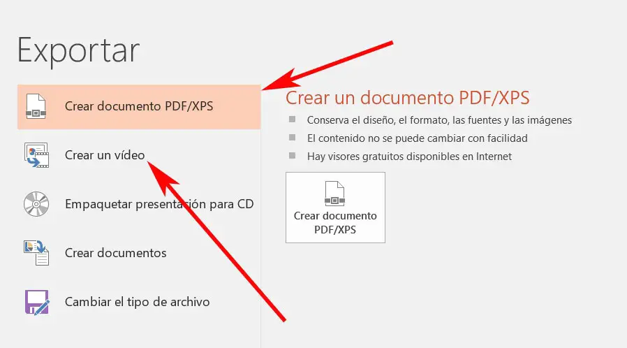 Ainsi, une fois dans ce cas, dans la partie gauche de l’ interface, nous verrons les différentes options que PowerPoint nous présente dans ce cas, parmi lesquelles nous observons la possibilité de «Créer une vidéo», «Emballer la présentation pour CD», créer un document modifiable pour être utilisé dans le programme Microsoft Word, ou pour générer un fichier au format PDF . Par conséquent, à ce stade, nous n’avons qu’à cliquer sur l’alternative qui nous intéresse le plus à ce moment-là et à y spécifier une série de paramètres de base.