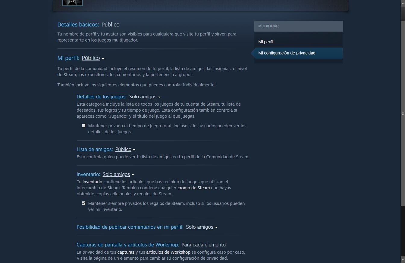 De plus, nous pourrons également configurer la façon dont nous voulons la confidentialité des détails du jeu, la liste d’amis, notre inventaire et si nous voulons que d’autres puissent publier ou non des commentaires sur notre profil.