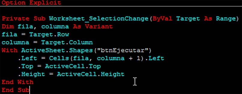 - Dans ce code, nous disons à Excel que chaque fois que nous nous déplaçons dans la feuille, calculons la position de la cellule et l’affectons à la forme automatique appelée «btnEjecutar».