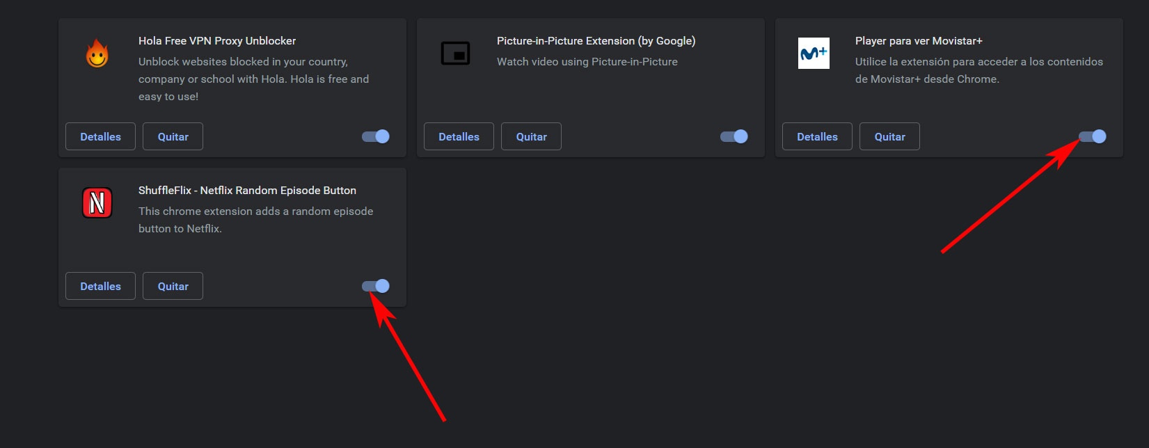 D’autre part nous avons également la possibilité d’activer ou de désactiver cette position des icônes depuis le menu «Plus d’outils / Extensions» de Chrome, où chacun de ces éléments apparaît avec un sélecteur pour être vu à côté de la barre d’adresse , ou non . Et enfin nous aurons également la possibilité de redimensionner la taille de ladite barre pour faire disparaître tous ces objets de la vue, bien qu’ils soient toujours actifs et à notre disposition.