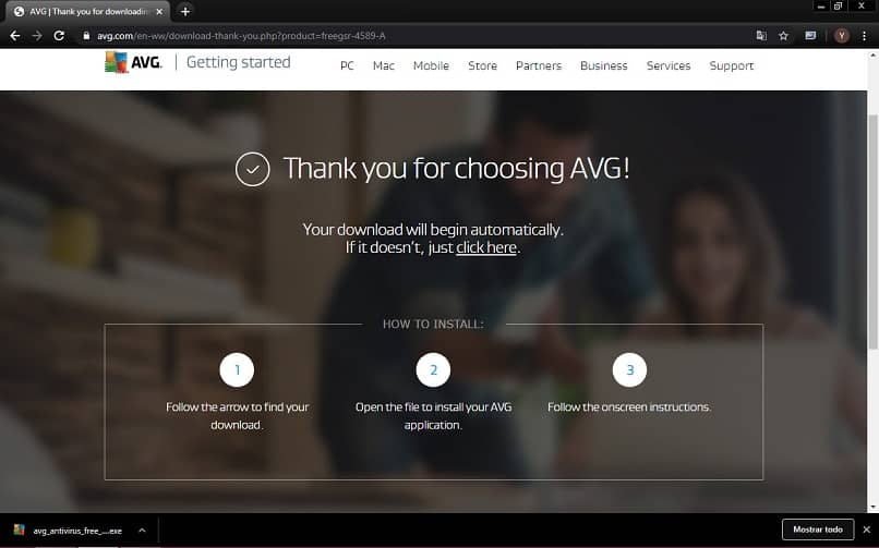 Il est vraiment très facile d’acheter gratuitement l’antivirus AVG. Il suffit de visiter leur page officielle www.avg.com et nous y trouverons un lien direct. Il est vert et dit «Téléchargement gratuit», cliquez dessus pour aller dans la zone qui dit que le téléchargement se fera automatiquement ou sinon cliquez sur «cliquez ici».