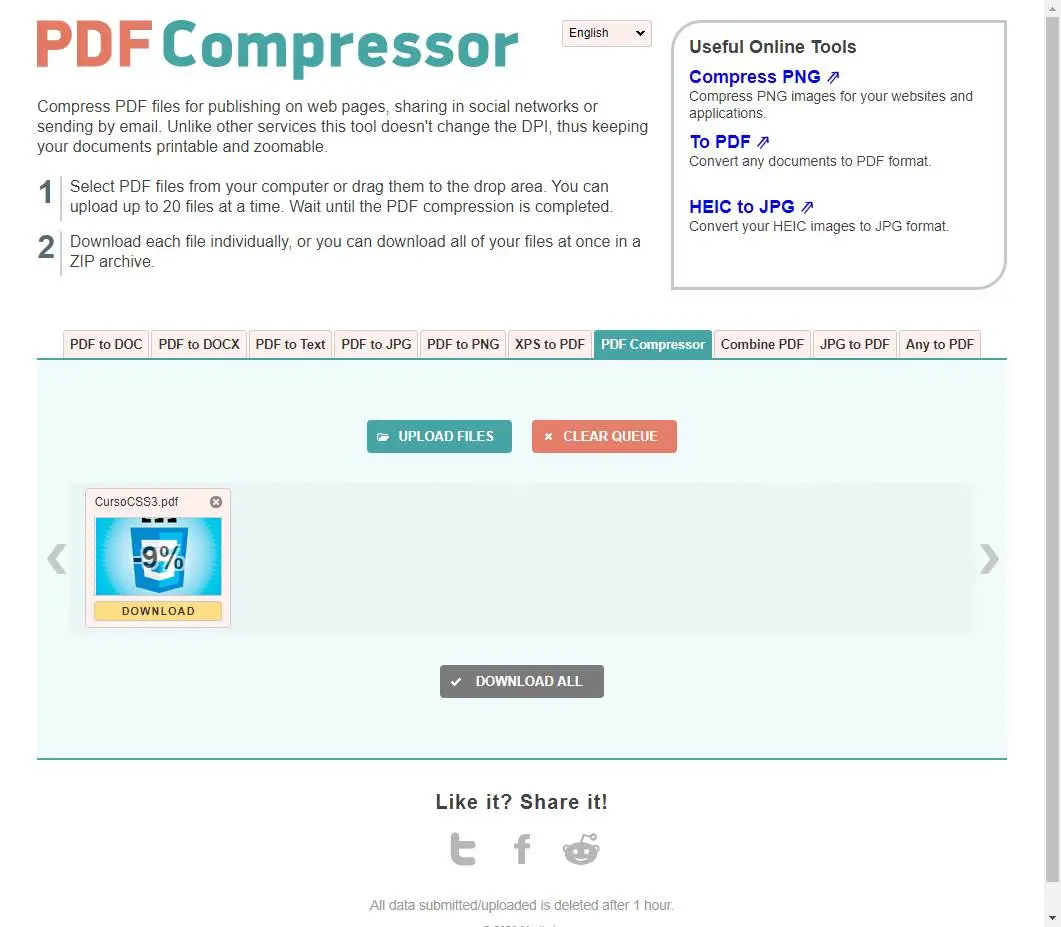 Son utilisation est très simple. Nous devons simplement télécharger le document sur le Web et il le traitera directement. Lorsqu’il est terminé, nous pouvons voir combien a été compressé et télécharger la nouvelle version réduite sur notre PC.