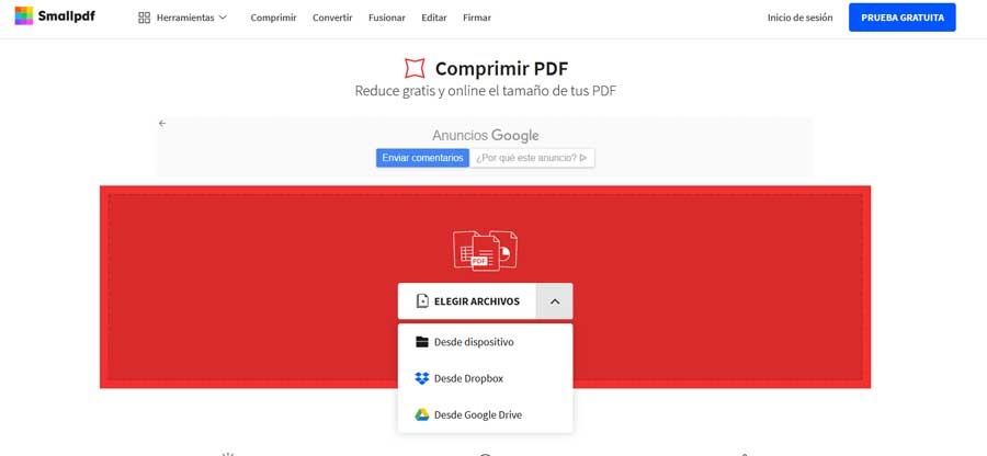Nous trouvons ici une autre plateforme en ligne similaire à celles mentionnées ci-dessus qui, en quelques étapes, nous permettra de compresser des fichiers au format PDF. En fait, étant des applications en ligne, nous n’aurons pas besoin d’installer de logiciel localement sur le PC. Pour tirer le meilleur parti de cette alternative bureautique dont nous parlons, il suffit de faire glisser le fichier en question vers l’interface du programme, c’est aussi simple que cela. De la même manière, nous avons la possibilité de cliquer sur le bouton Choisir les fichiers pour sélectionner la source à partir de laquelle nous voulons charger le contenu. Ici, nous pouvons choisir entre des fichiers locaux ou enregistrés dans le cloud.