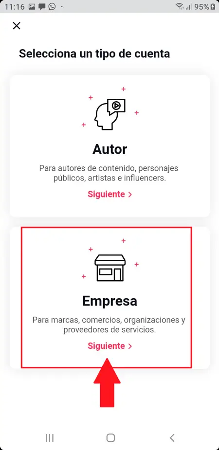 - Ensuite, vous devez sélectionner le type de compte que vous souhaitez, parmi les options vous verrez «Compte Auteur» et «Compte Entreprise», dans ce cas, sélectionnez celui qui correspond le mieux à vos besoins .